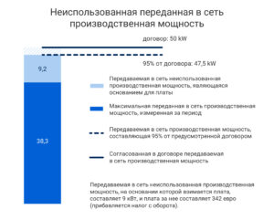 Пример: передаваемая в сеть мощность по договору составляет 50 кВт, 95-процентное требование производства от которых составляет 47,5 кВт. Максимальная мощность, измеренная за период, составляет 38,3 кВт. Разница между 95-процентным требованием производства и фактической выработкой равна неиспользуемой мощности, на основании которой взимается плата: 47,5 кВт – 38,3 кВт = 9,2 кВт, округляется в меньшую сторону, и плата взимается за 9 кВт.